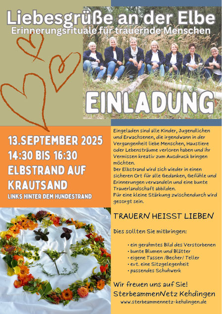 Unser Ansinnen ist es, unseren Verstorbenen am Elbstrand aktiv und vor allem kreativ zu gedenken und ihnen auf vielfältige Weise unsere guten Wünsche zu übertragen. Willkommen sind Kinder, Jugendliche und Erwachsene, die egal wann in der Vergangenheit liebe Menschen, Haustiere, Beziehungen oder auch Lebensträume verloren haben und ihr Vermissen zum Ausdruck bringen möchten. Für zwei Stunden wird der Platz hinter dem Hundestrand wieder zu einem sicheren Ort für alle Gefühle, Gedanken und Erinnerungen - und wird sich in eine durchaus bunte, eindrucksvolle Trauerlandschaft verwandeln. Sehen Sie einem berührend schönen Nachmittag im Kreise Gleichgesinnter entgegen und merken Sie sich diesen Tag unbedingt vor!